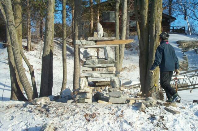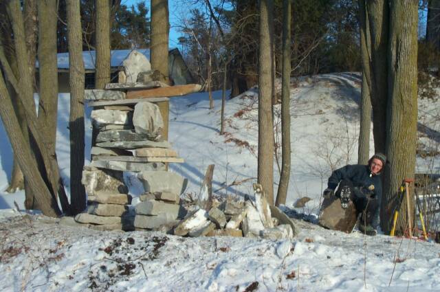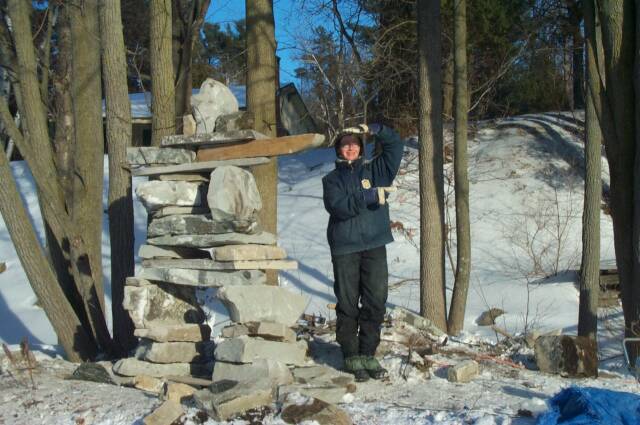 Who says you can't do landscape work in the middle of February in -20C weather? Some pictures of the Inukshuk (Inuksuk, Inushuk) that me and Kris made.