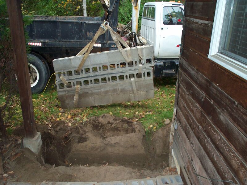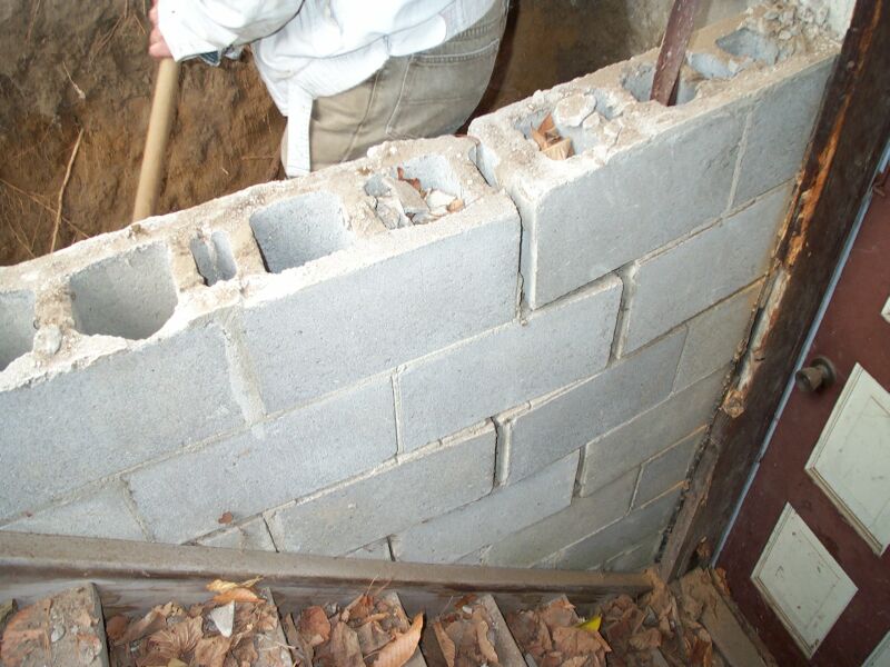 Here's my attempt at a slip form masonry stone wall. I wanted to install a new door to my basement, but before I could I had to fix the CMU wall that had failed. It was built without a footing, with no reinforcement, and without grout filling the blocks. On top of all that it wasn't even built to the depth of the stairs, so soil was passing under the wall and into the stair area.