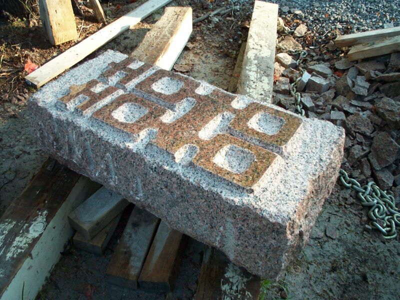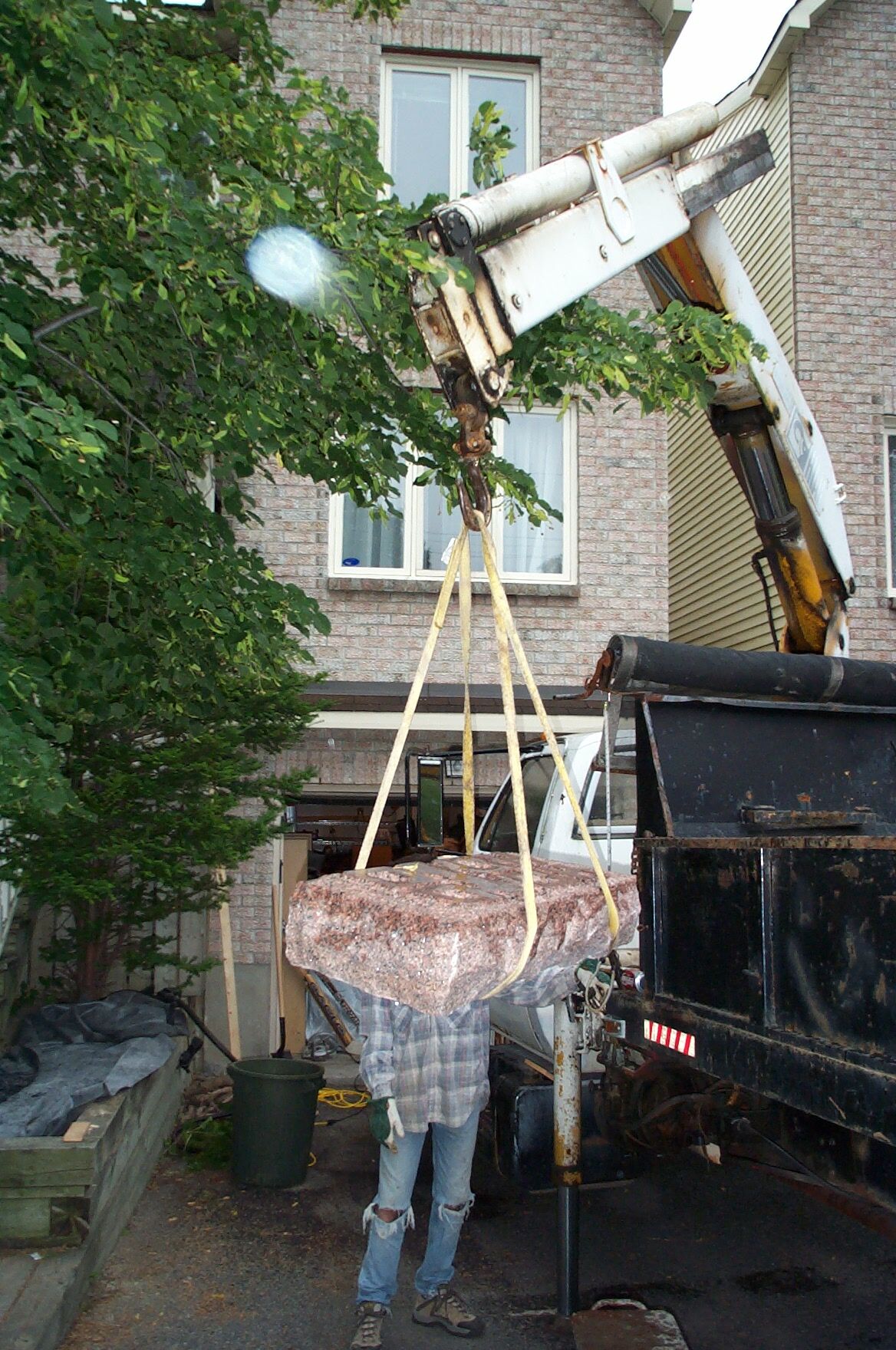 the fountain. At this point I had used a drill and feather and wedges to split the large piece off the stone in the back and had started cutting the hole in the fountain with the diamond chainsaw. I had also drilled a 16" deep