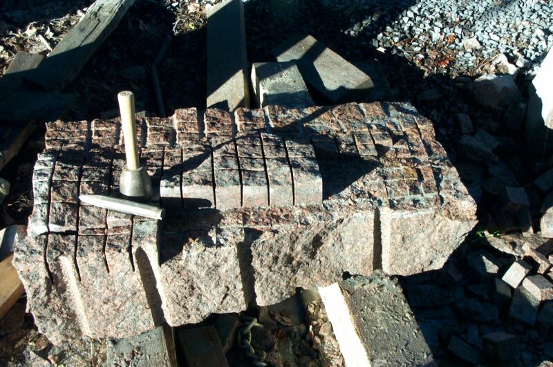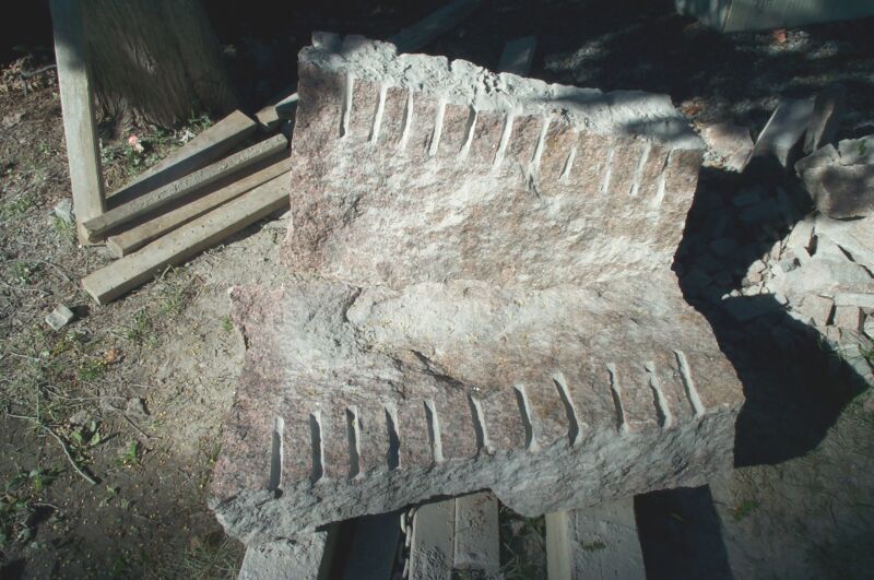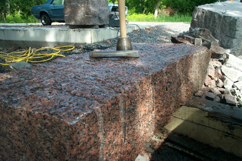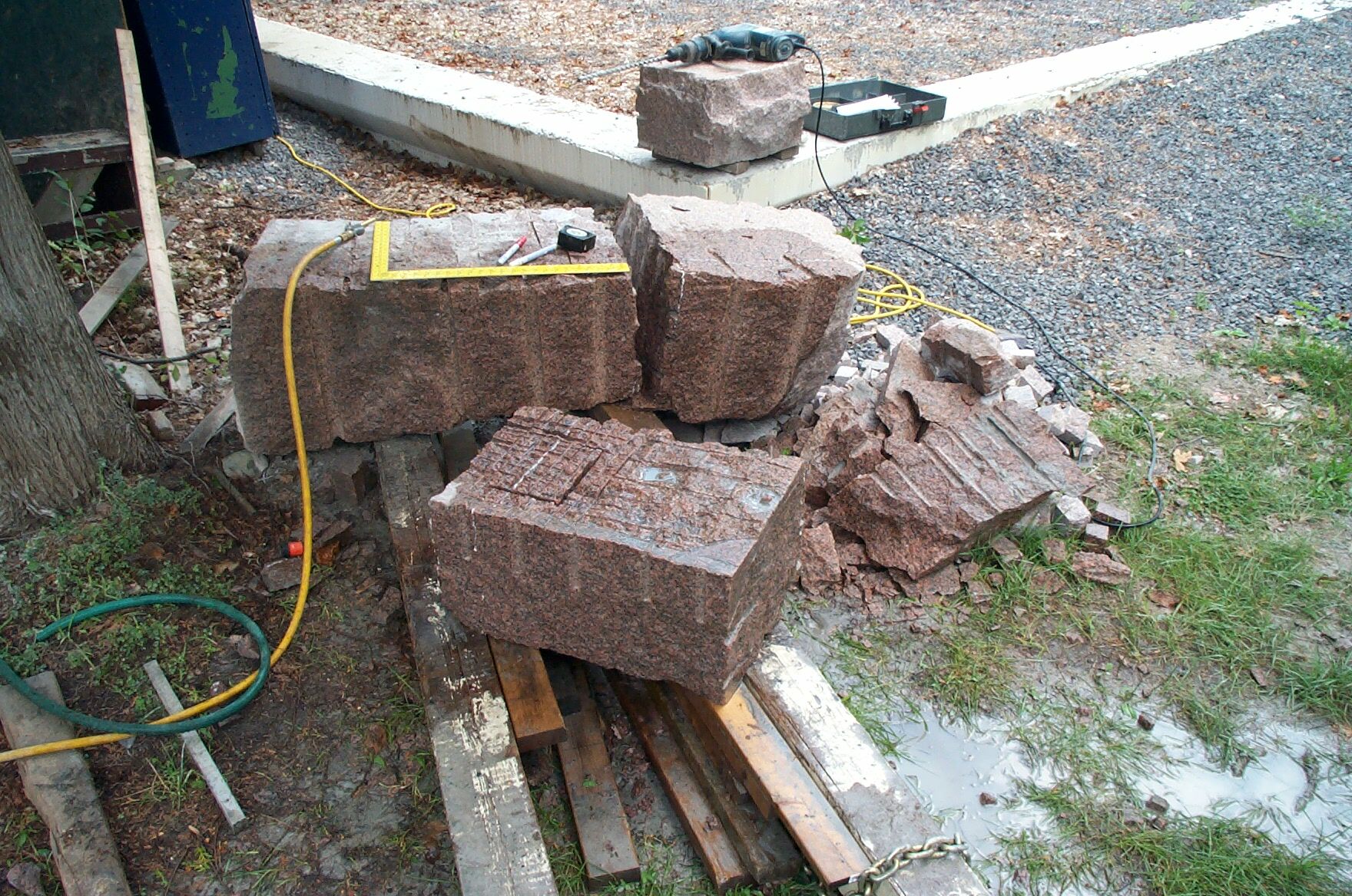 Squaring up the stone by splitting with feather and wedge. First a series of 4" deep 3/4" holes are drilled using a large hammer drill, then the feather and wedges are placed in the holes. Hit with a hammer repeatedly forcing the stone to split.