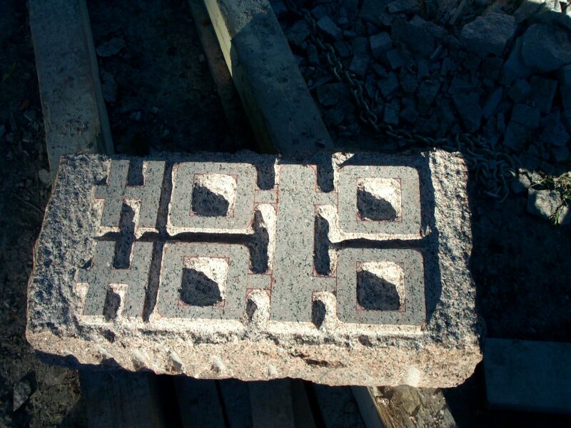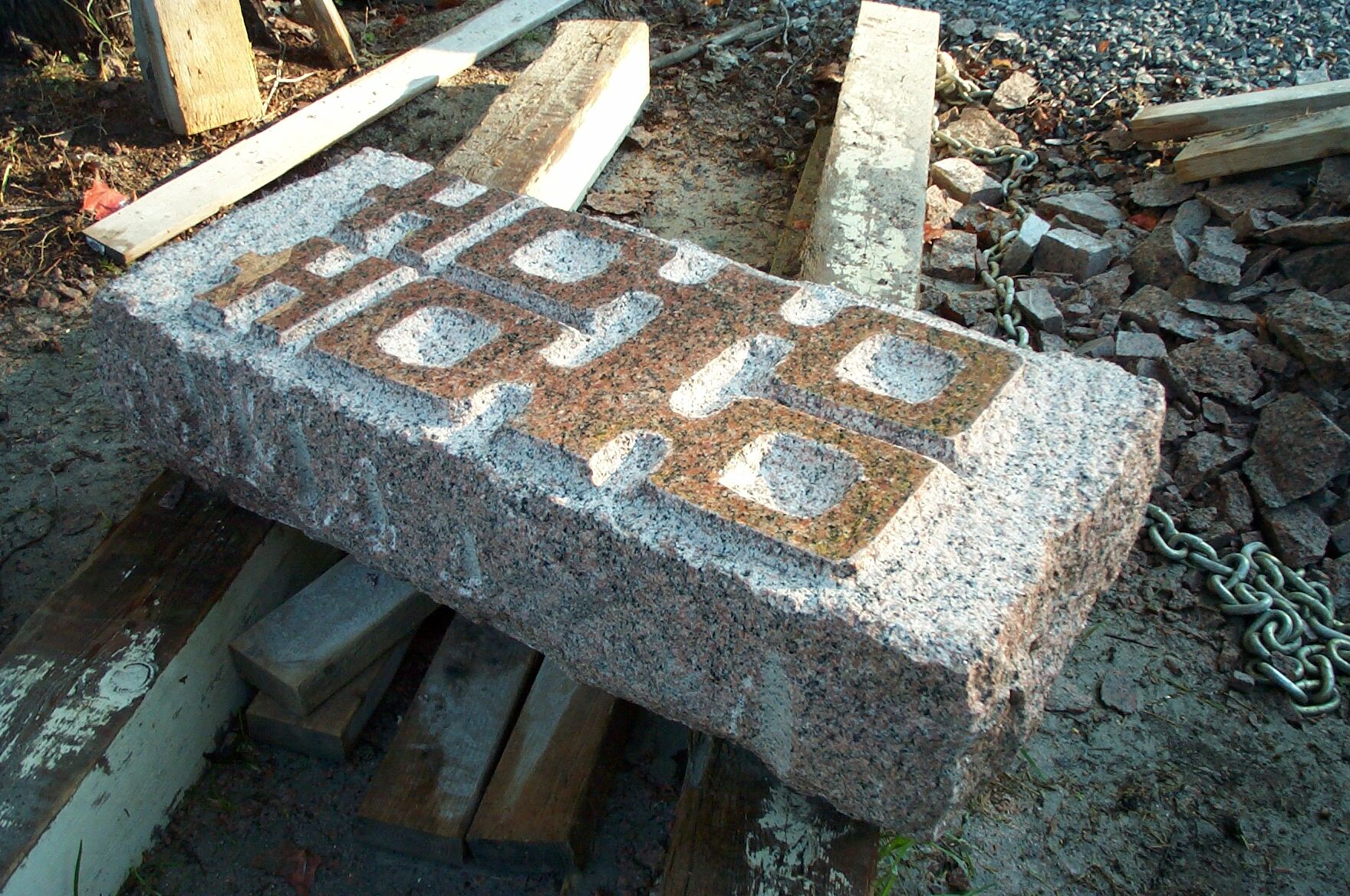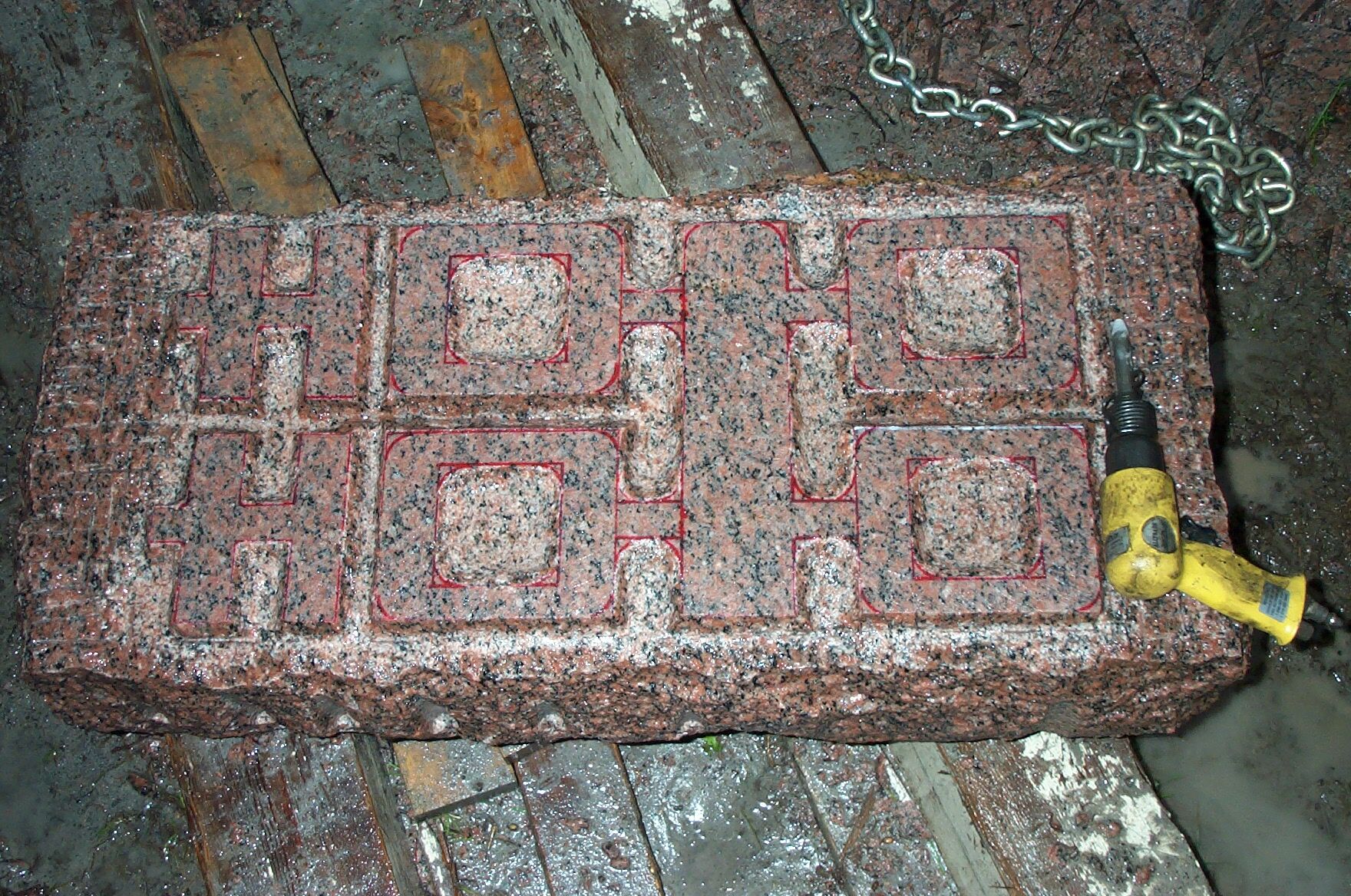 I used a 5" diamond blade to make cuts around the pattern. Although I cut too close in places. I used a 1" roughing chisel and a 3/8" point to carve the symbols.
