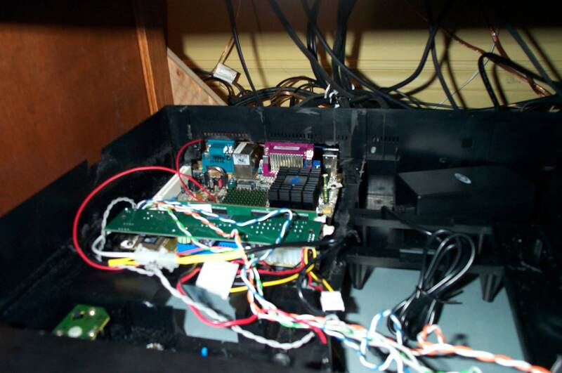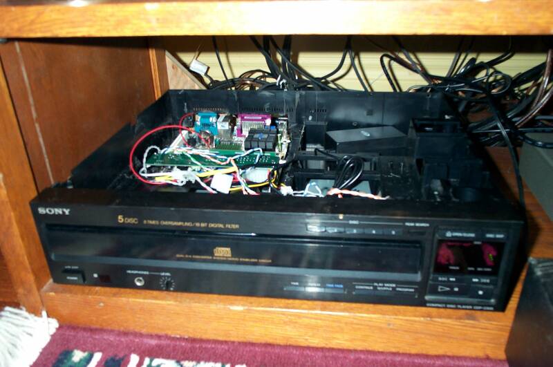 I gutted the old CD inners, and cut a hole in the rear of the case for the hook-ups. I then used the existing IR receiver (a Sharp GP1U52XB) from the CD player and wired it to the EPIA 5000 serial port. The power and reset were wired to existing buttons on the front panel of the CD player case. To stay fanless I used this power supply, and a 12V AC - DC inverter. An inverter from a Gamecube works fine with the DC power supply (available at Toys R Us) or you can buy one from the same place that sells the power supply. Be careful if running hard drives or a PCI card, these will require additional power. Make sure the power supply can provide the needed power.
