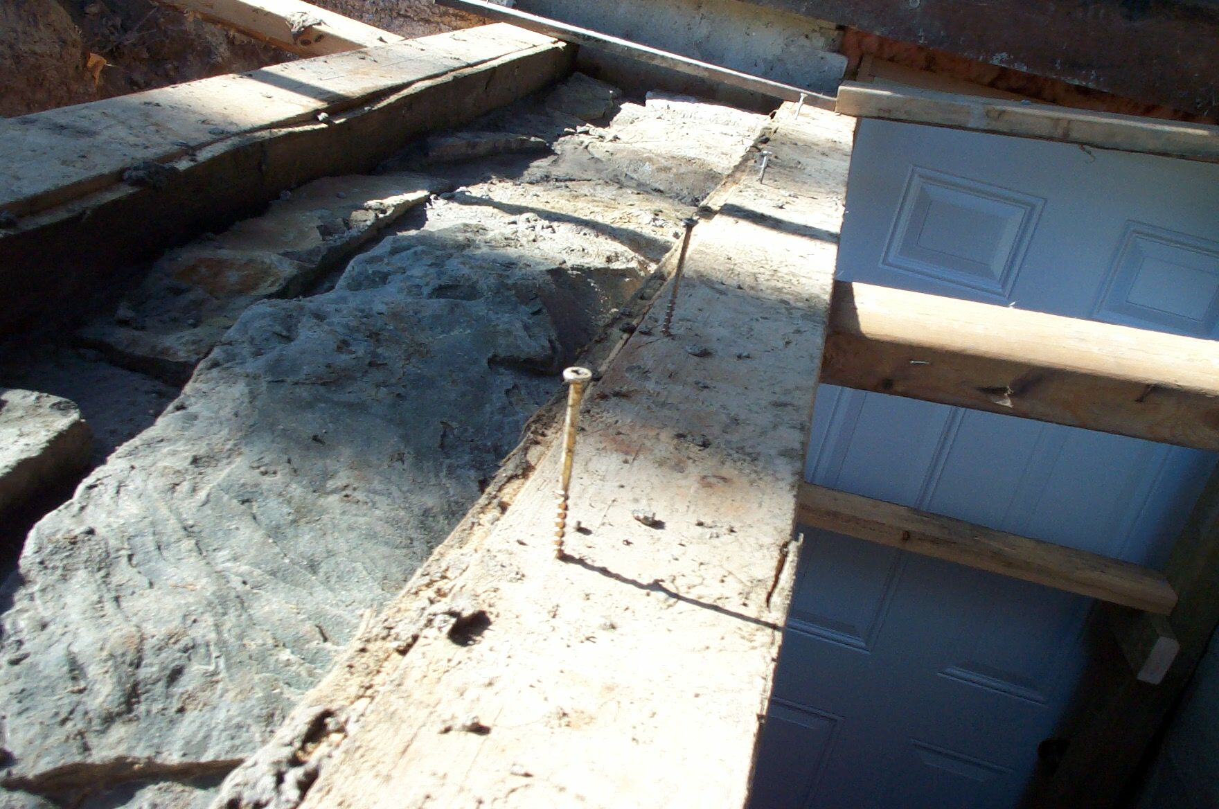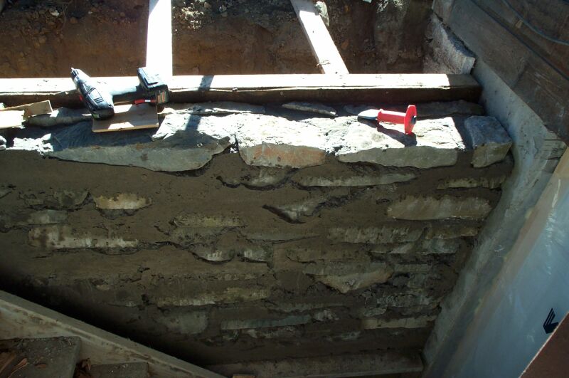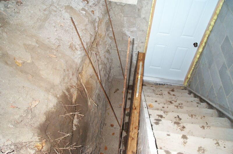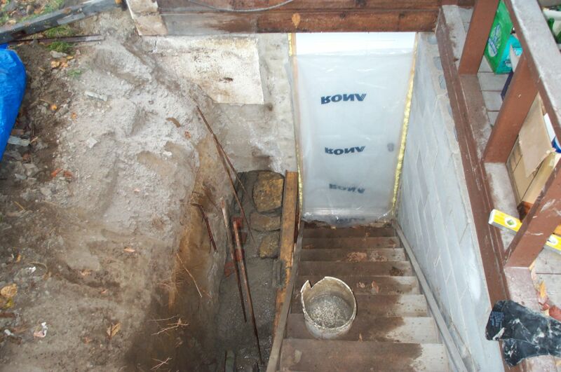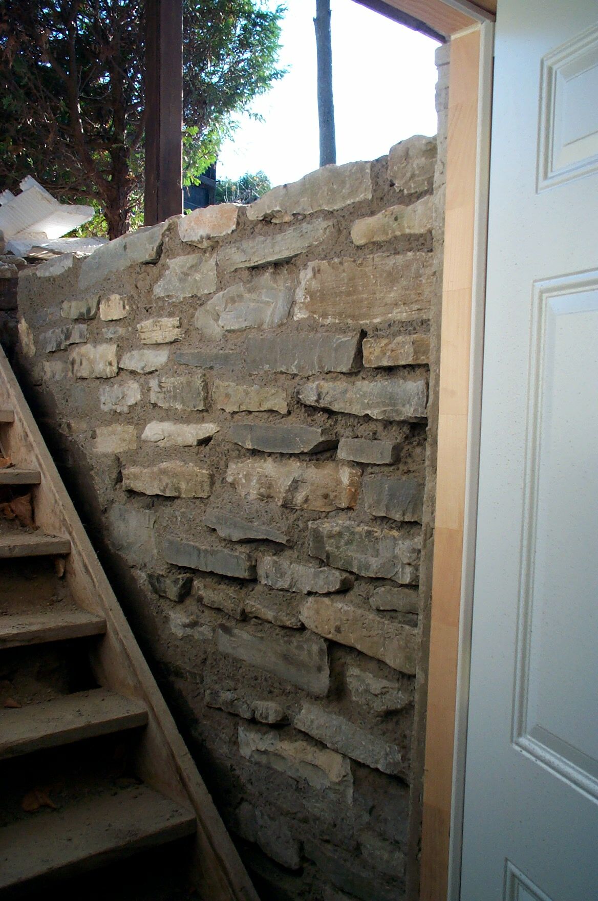 Here's my attempt at a slip form masonry stone wall. I wanted to install a new door to my basement, but before I could I had to fix the CMU wall that had failed. It was built without a footing, with no reinforcement, and without grout filling the blocks. On top of all that it wasn't even built to the depth of the stairs, so soil was passing under the wall and into the stair area.