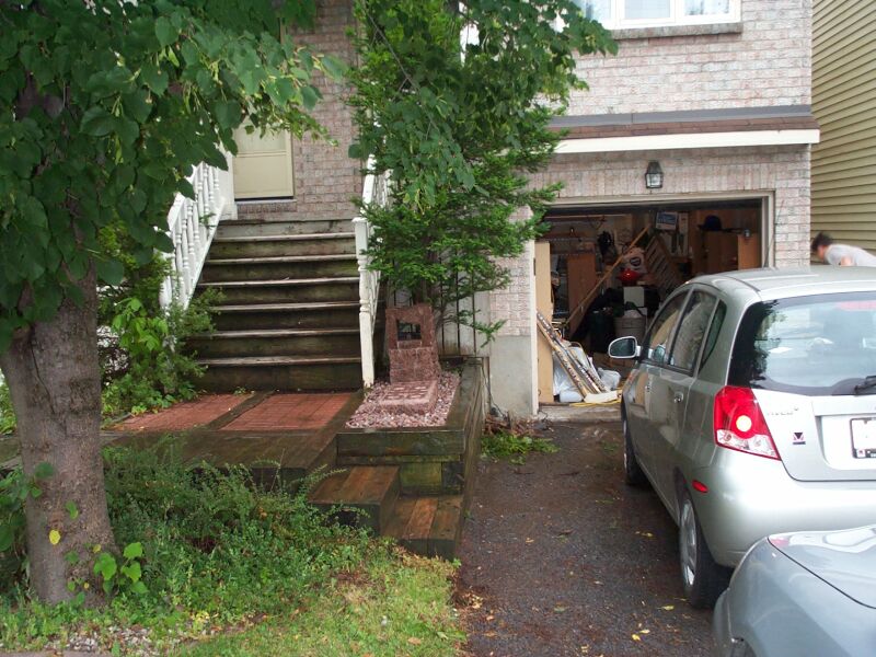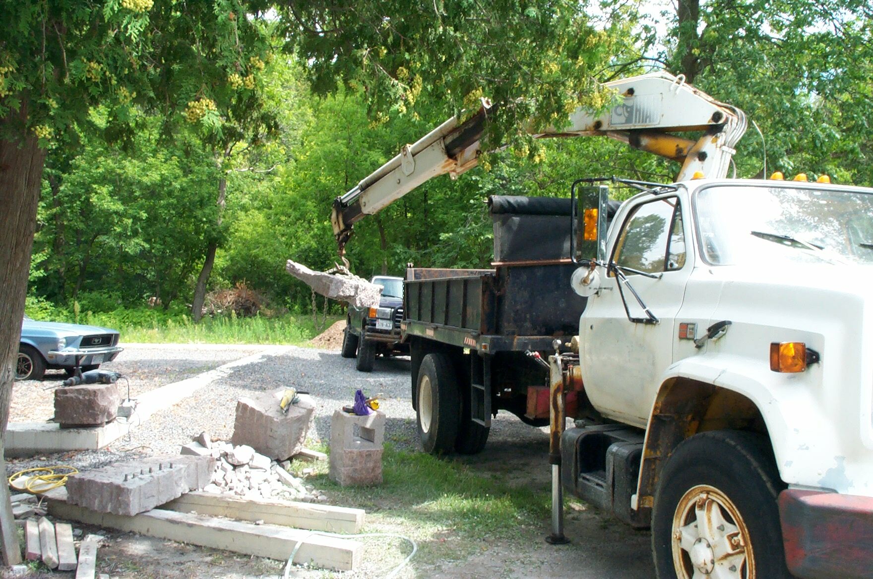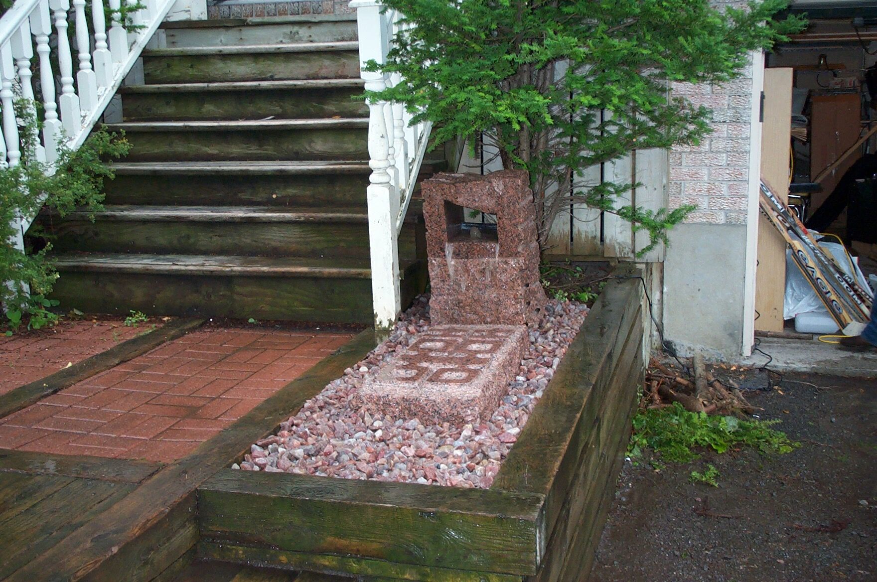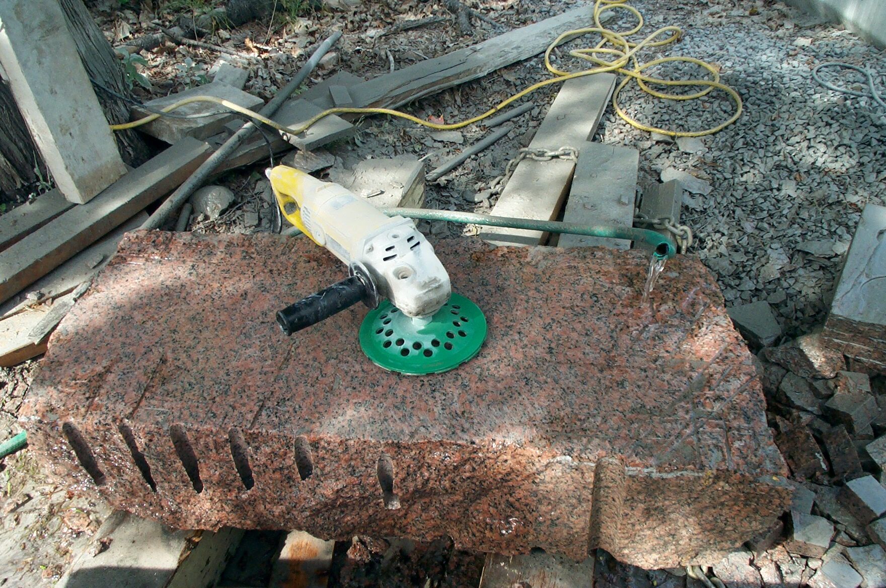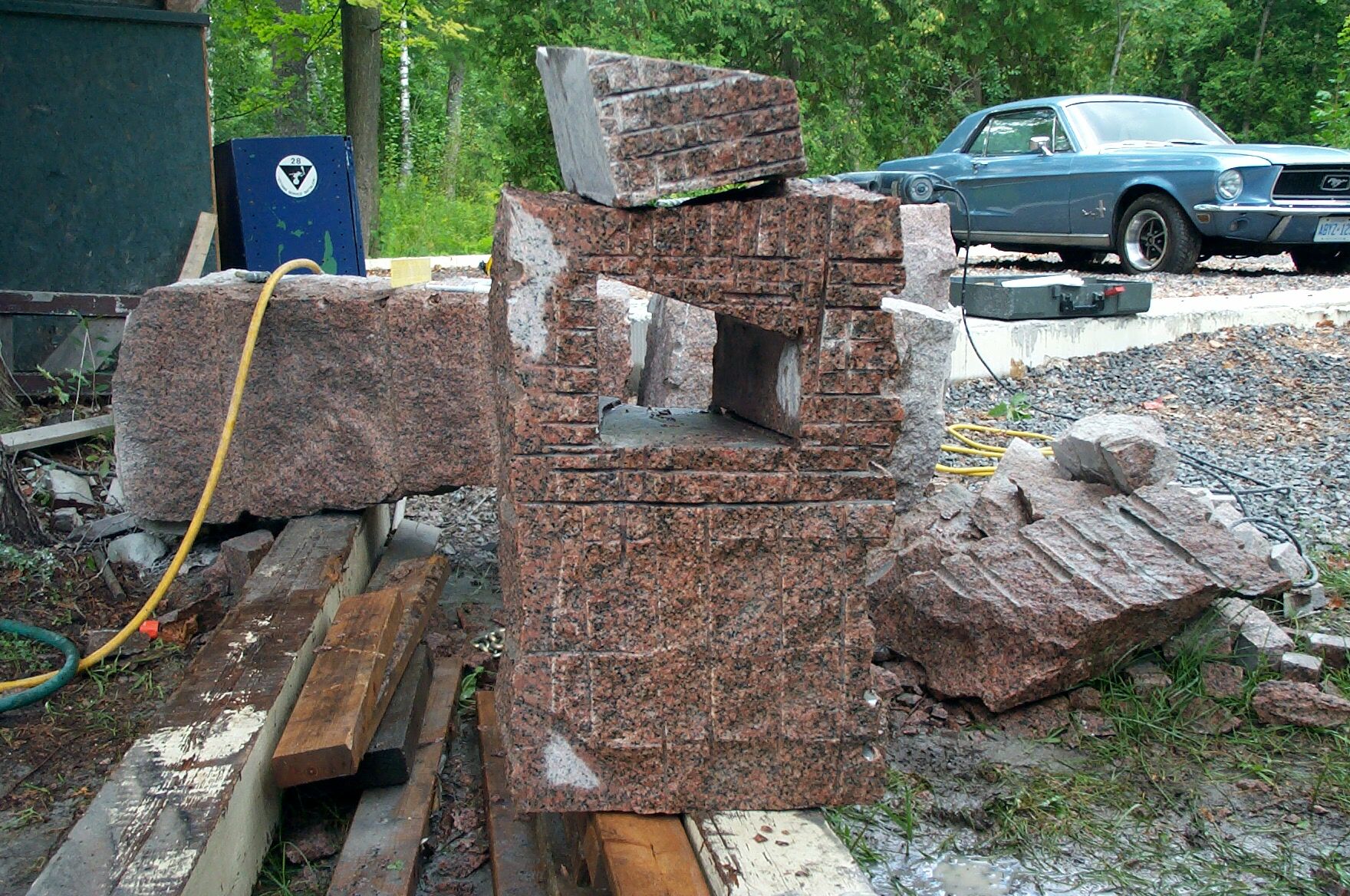 the fountain. At this point I had used a drill and feather and wedges to split the large piece off the stone in the back and had started cutting the hole in the fountain with the diamond chainsaw. I had also drilled a 16" deep