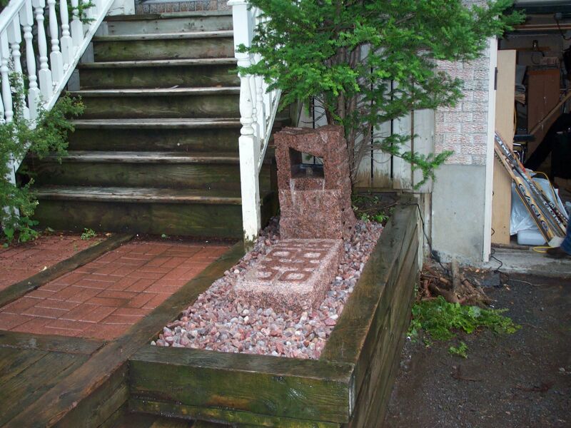 Installed. Look close, water coming out and everything! There is a reservoir at the front of the planter. Pink muscovite gravel was used around the stones.