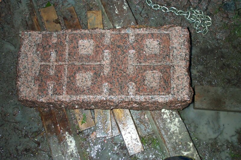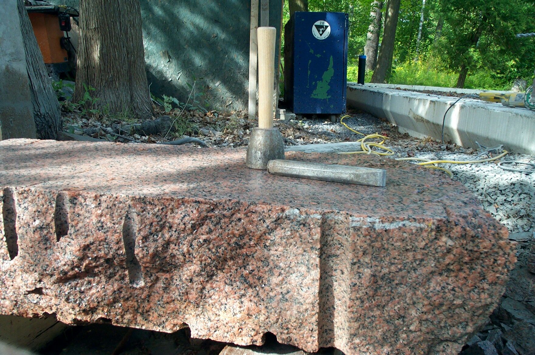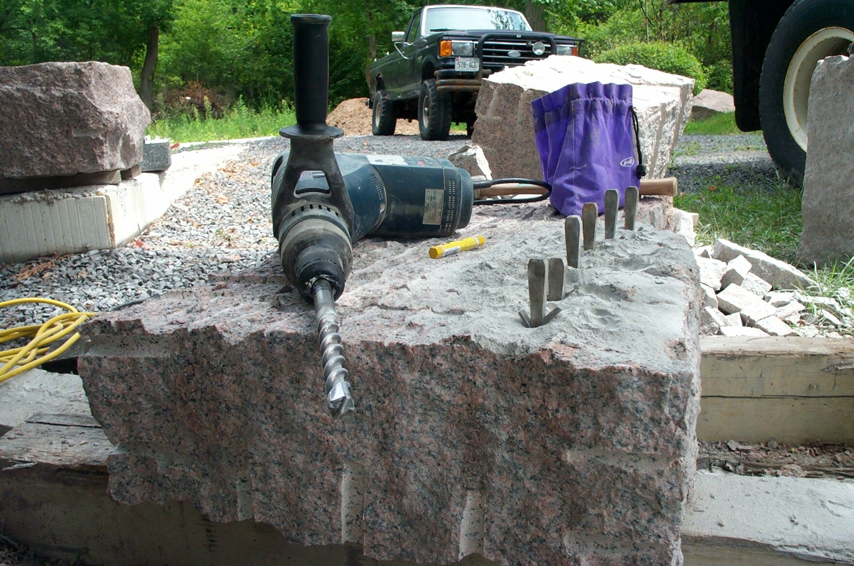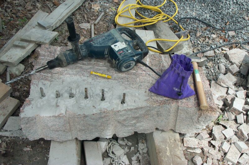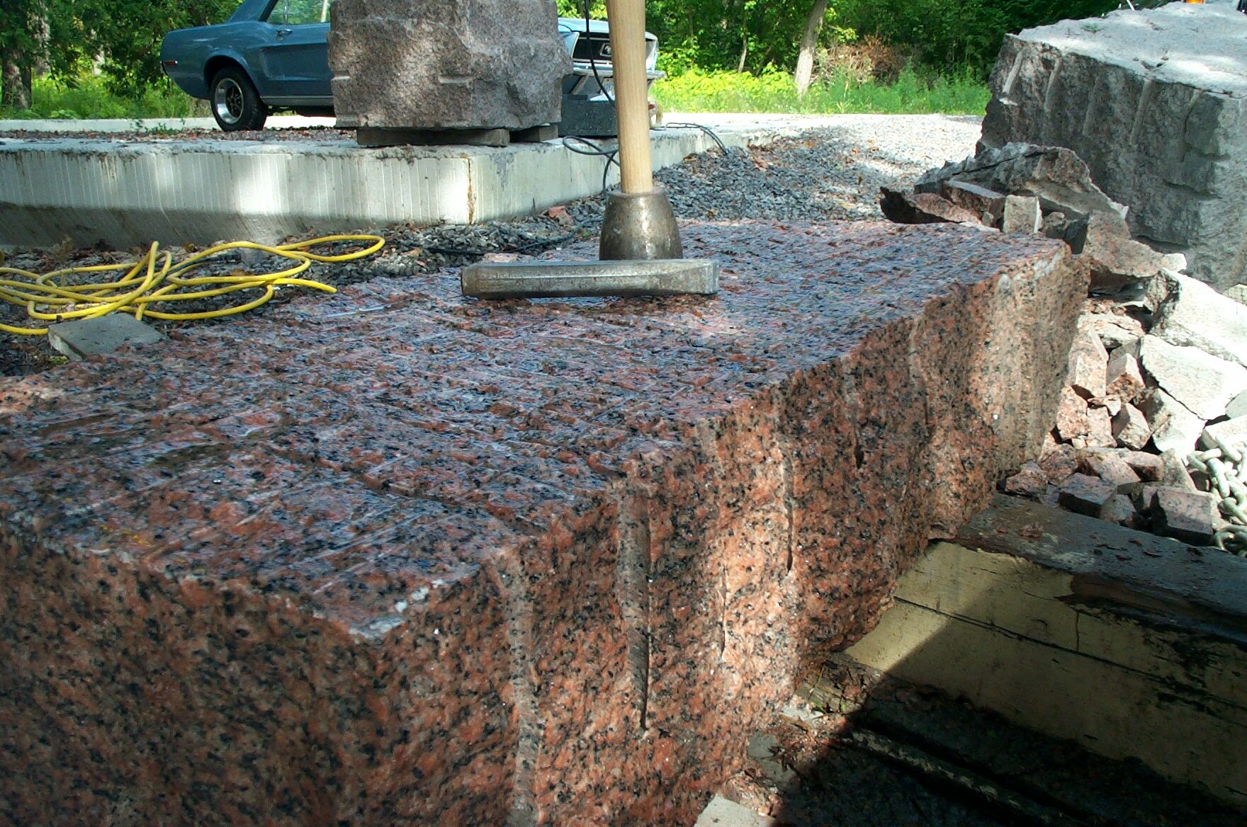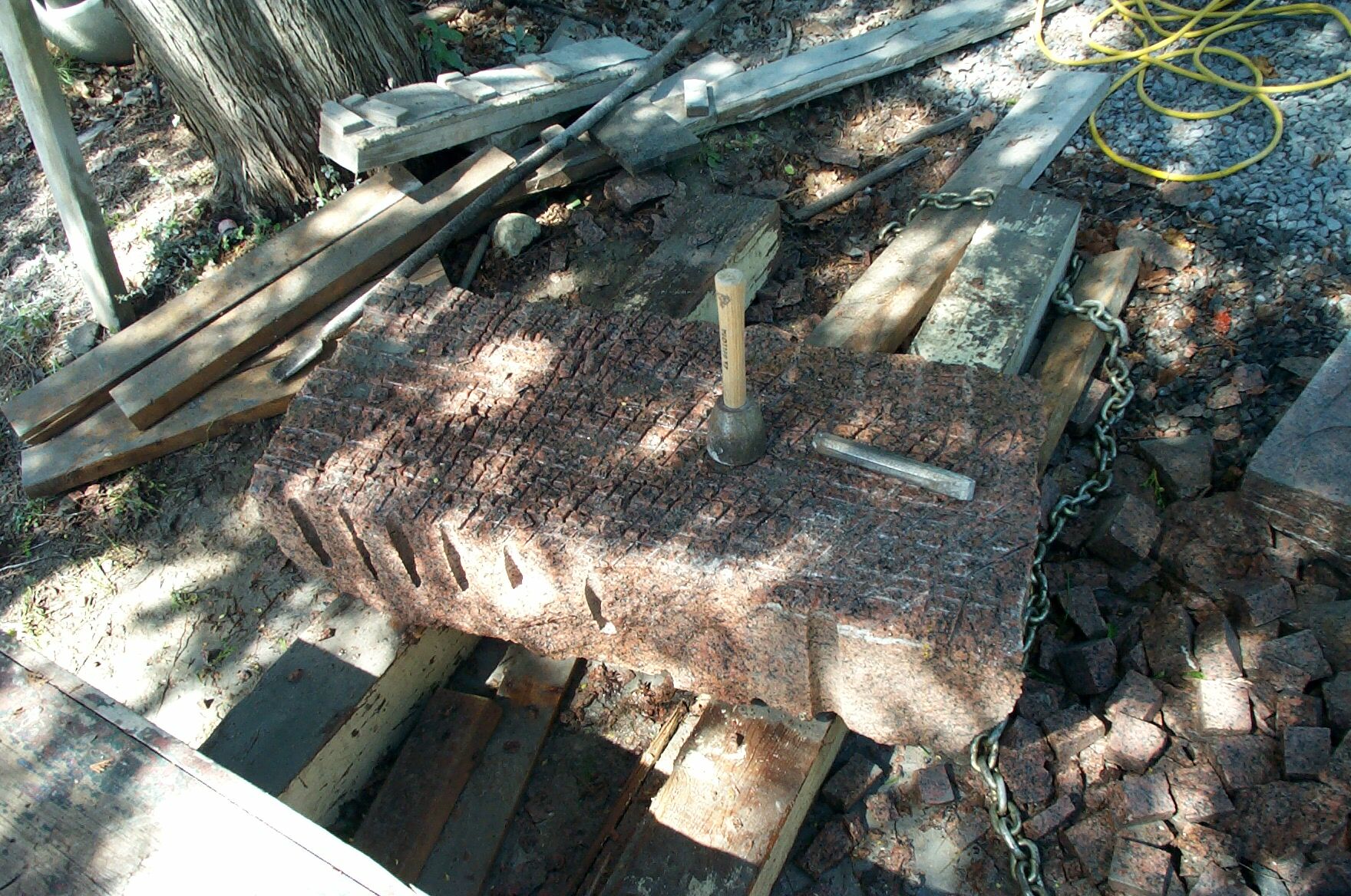 Squaring up the stone by splitting with feather and wedge. First a series of 4" deep 3/4" holes are drilled using a large hammer drill, then the feather and wedges are placed in the holes. Hit with a hammer repeatedly forcing the stone to split.