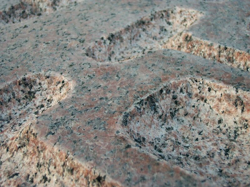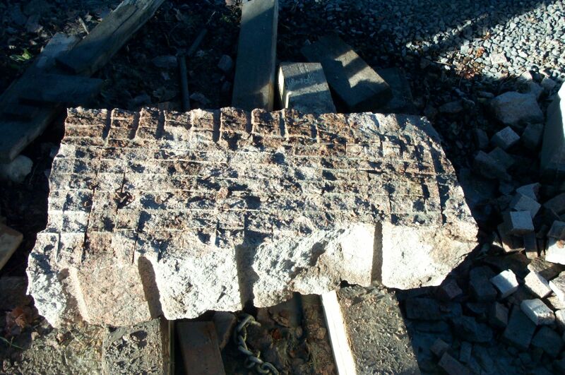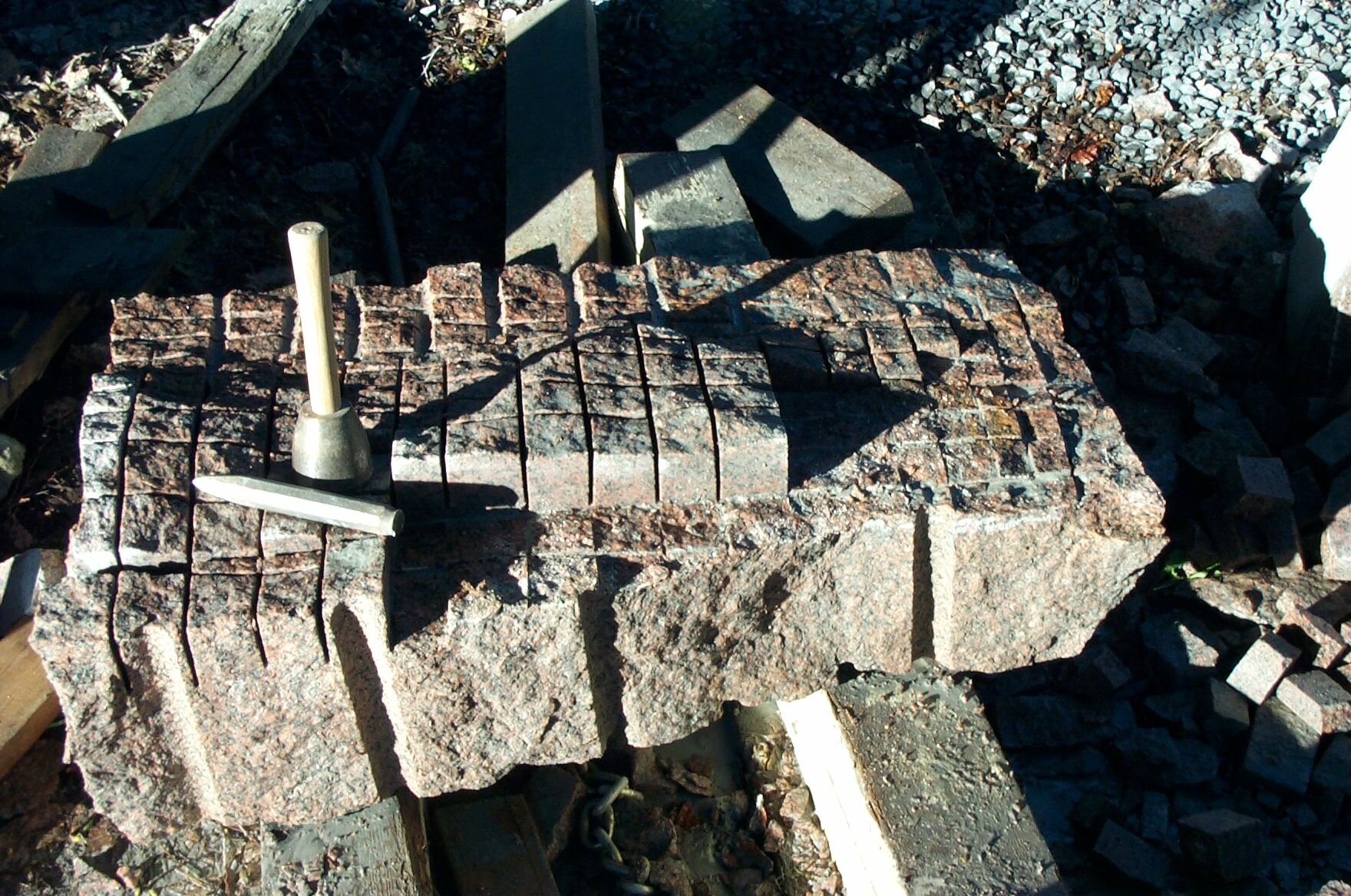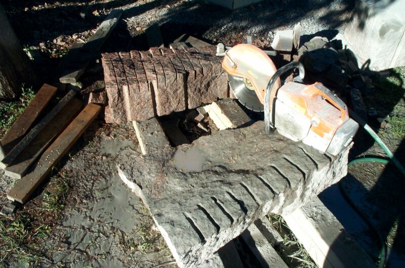To level out the stone I cut a criss cross pattern using a 14" gas cut off saw. Then knock out the cubes with a 1" roughing chisel.