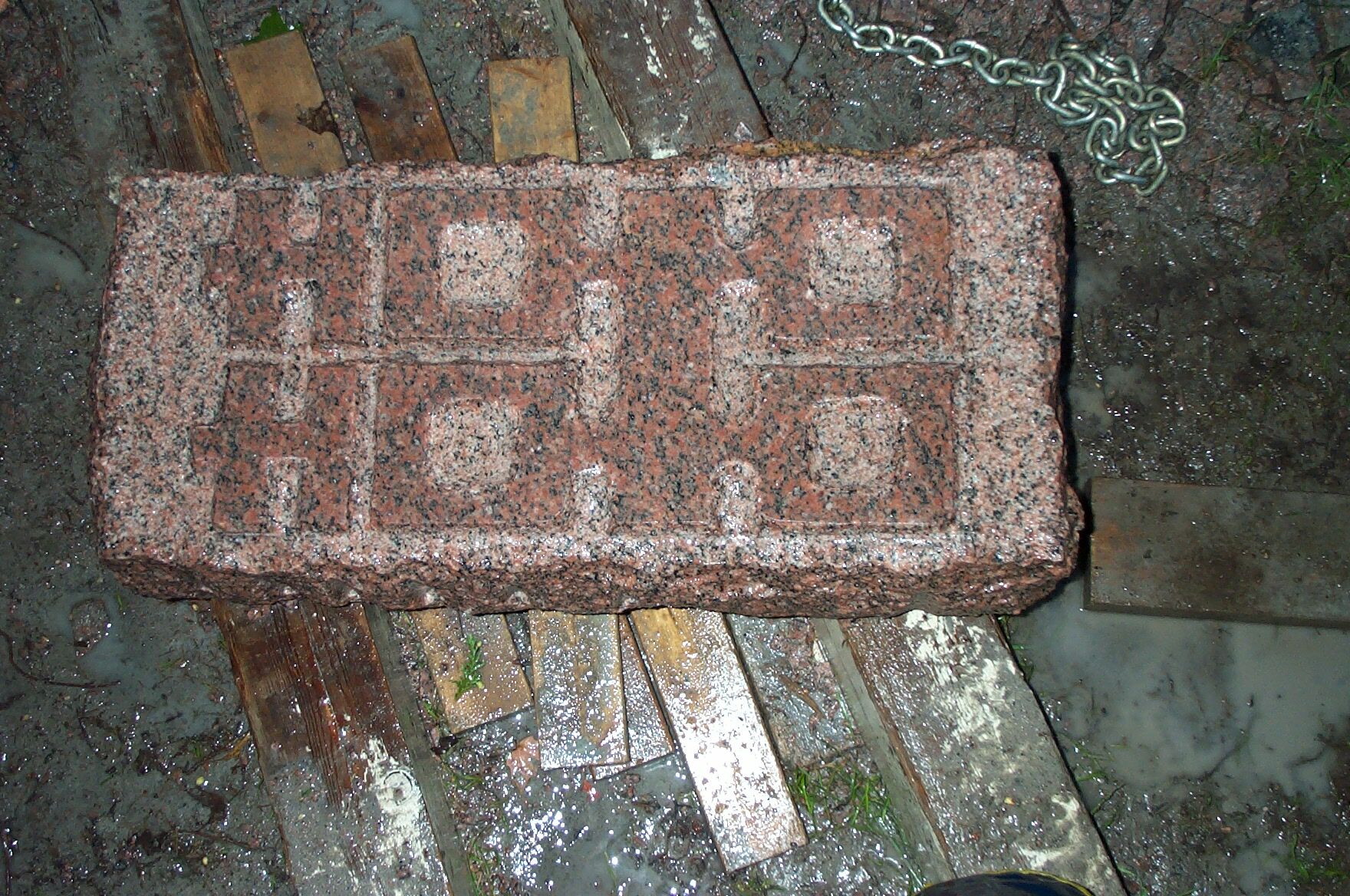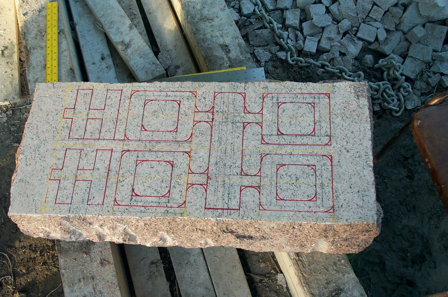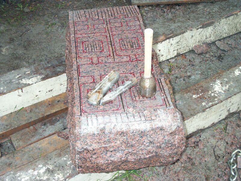 I used a 5" diamond blade to make cuts around the pattern. Although I cut too close in places. I used a 1" roughing chisel and a 3/8" point to carve the symbols.